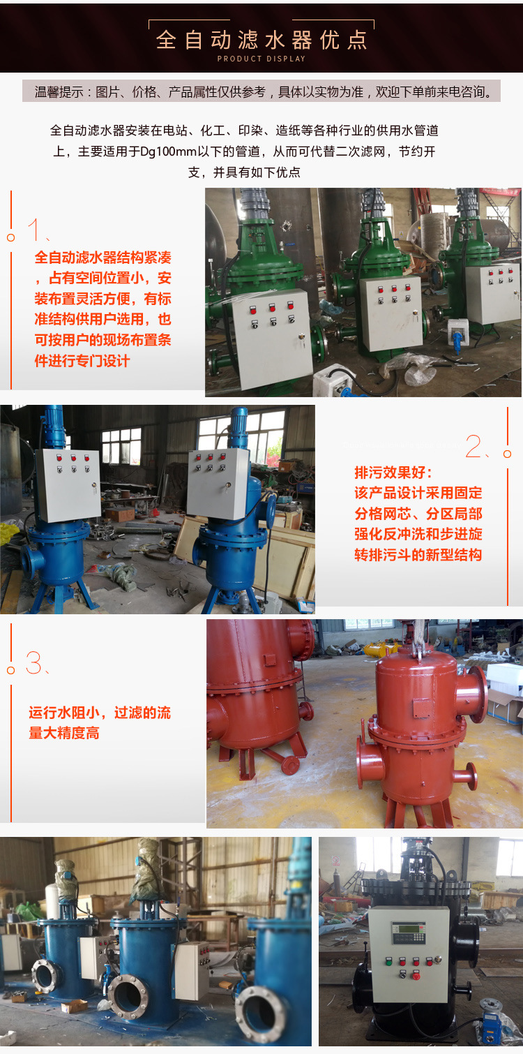 全自动滤水器安装在电站、化工、印染、造纸等各种行业的供用水管道上,主要适用于Dg100mm以下的管道,从而可代替二次滤网,节约开支,并具有如下优点;